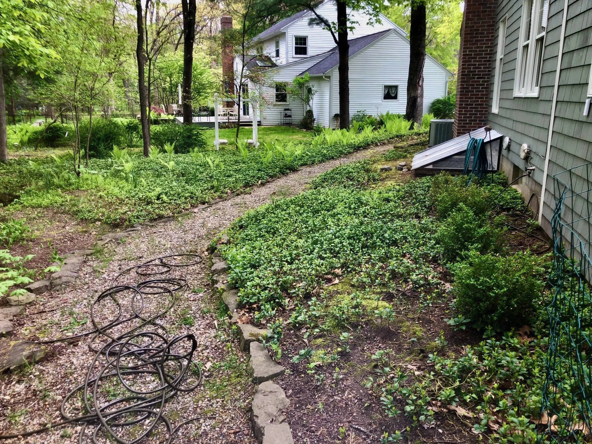 The big picture: Not ideal - an enormous bed of pachysandra, junky barberries, a dogwood tree that wasn’t performing well and some questionable looking boxwoods. This spot is heavily shaded and receives about 3-4 hours of sun at most. Due to the trees it is very root ridden in many areas.