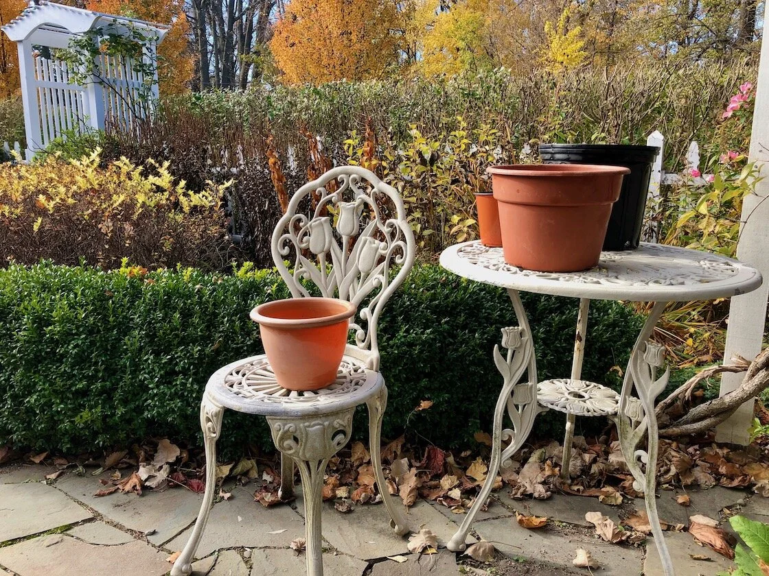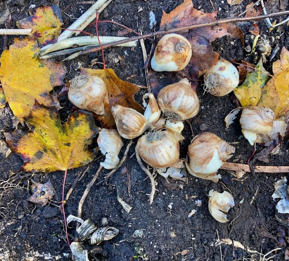 1. Find a place to overwinter potted bulbs. Your goal is to maintain a temperature of 35-50 degrees. An unheated garage or shed will do nicely. I have neither, so I leave mine outside in a protected spot on the south side of the house and cover them with leaves to prevent freezing. Digging a trench in your vegetable garden and covering the pots with leaves would also work.