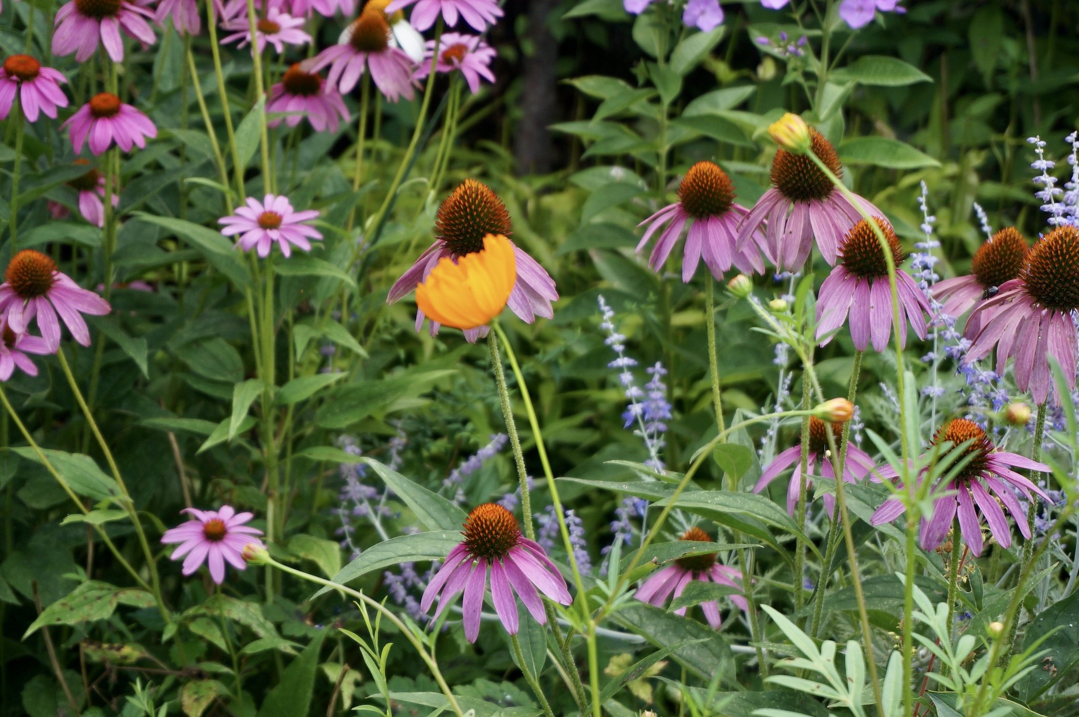 Thanks to the zinnia snafu and the discovery of Celosia ‘Shimmer,’ I realized that pink and orange combinations really rock. How did I not know this before? Here, a few leftover Cosmos ‘Sulphureus’ are tucked in among the coneflowers. Growing them from seed is ridiculously easy, and they’re definitely at the top of my list for next year.