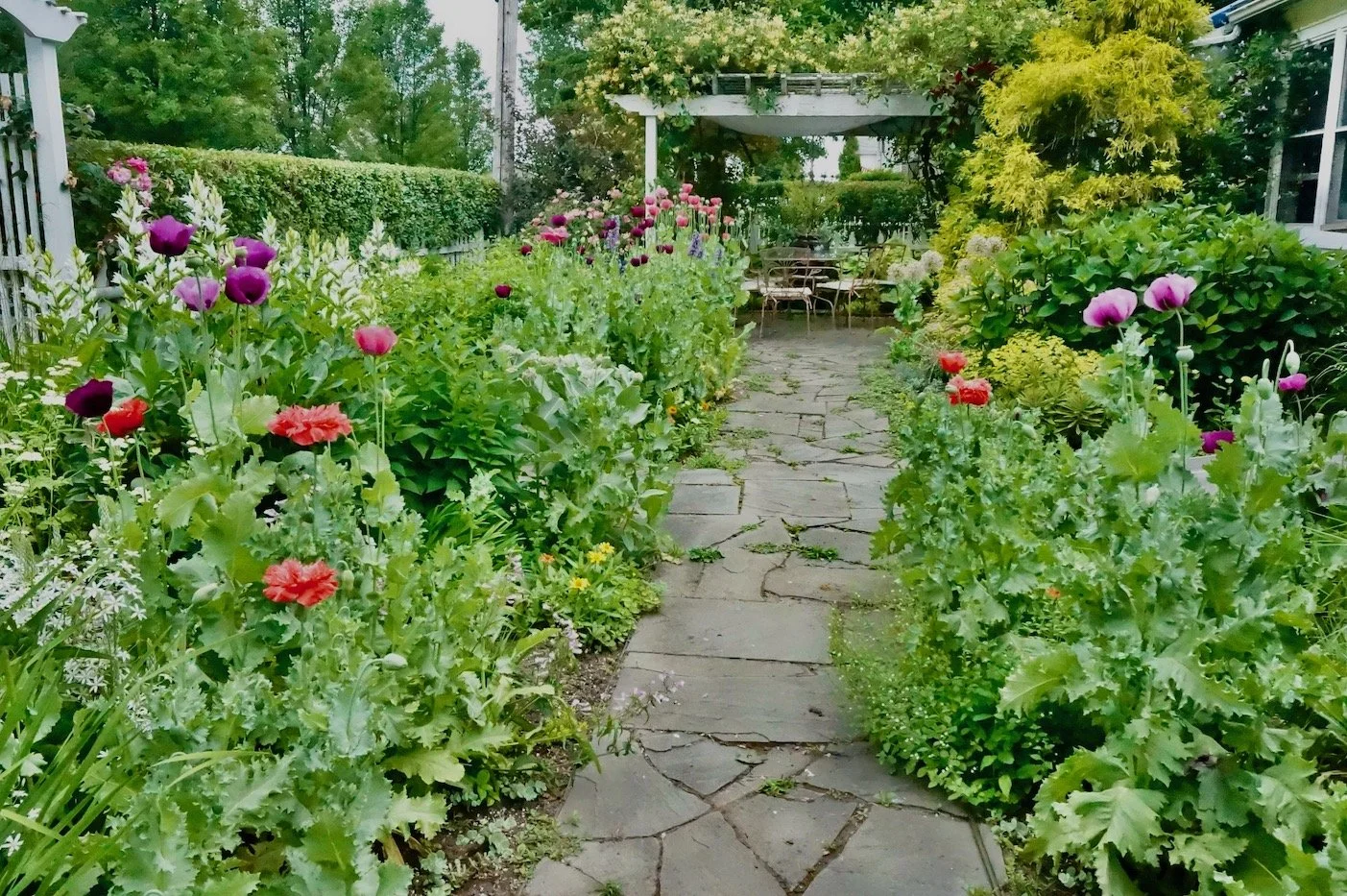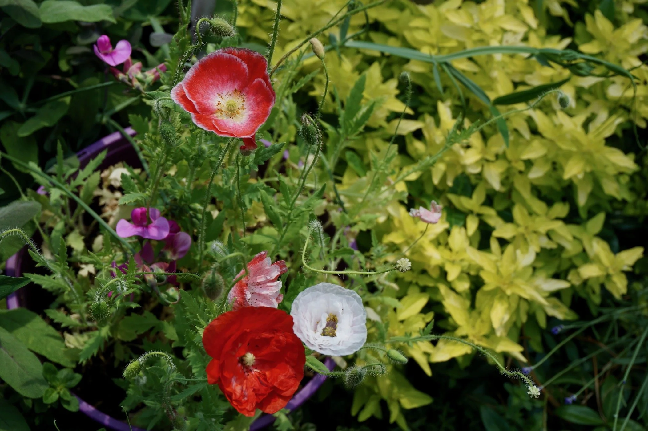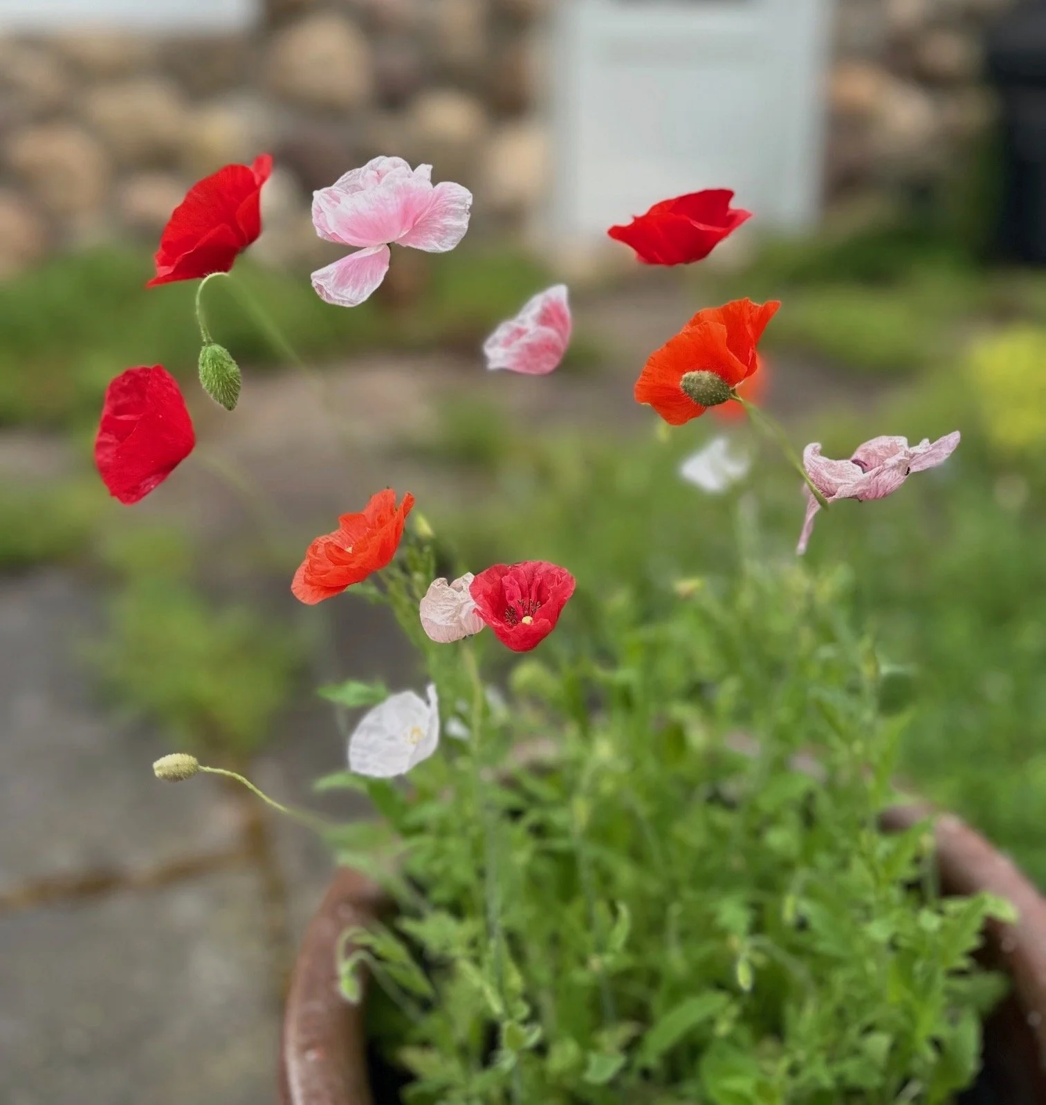 You can’t be too rich, too thin or have too many poppies. Some of you may remember my March blog when I wrote about longing for swathes of poppies and sowing them in pots to achieve success. To my surprise and delight, I’ve gotten a lot more than I bargained for. Not only do I have poppies starting to bloom in pots, random seedlings have taken over the entire garden. You know how they say be careful what you wish for? I fantasized about big swathes of poppies and got them in spades. Here’s what happened.